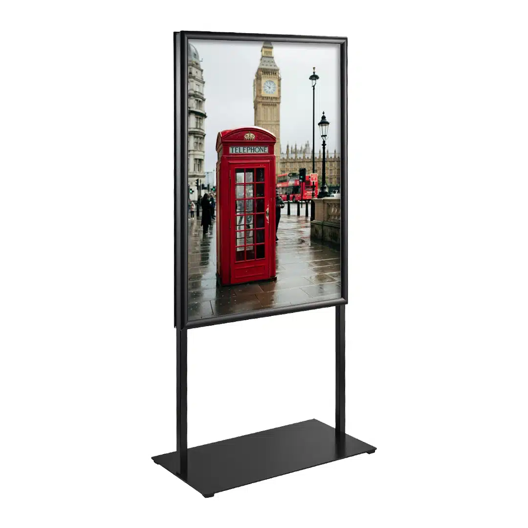 Musta kaksipuolinen julisteteline tukevalla metallijalustalla sekä kahdella alumiinisella A1 snap-kehyksellä, kehysprofiili 25 mm.