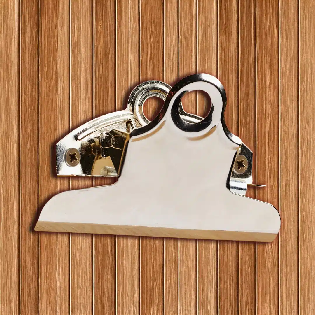 Suuri paperiklipsi, jossa ruuvireiät ruuvaamista varten.