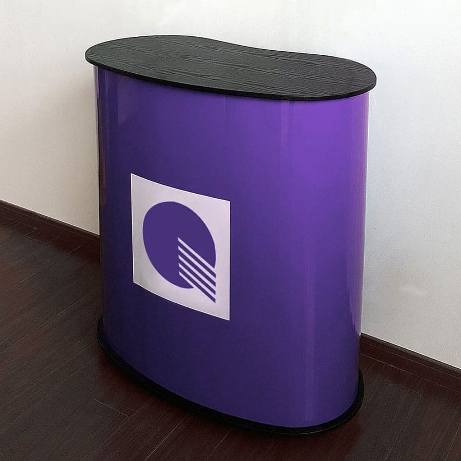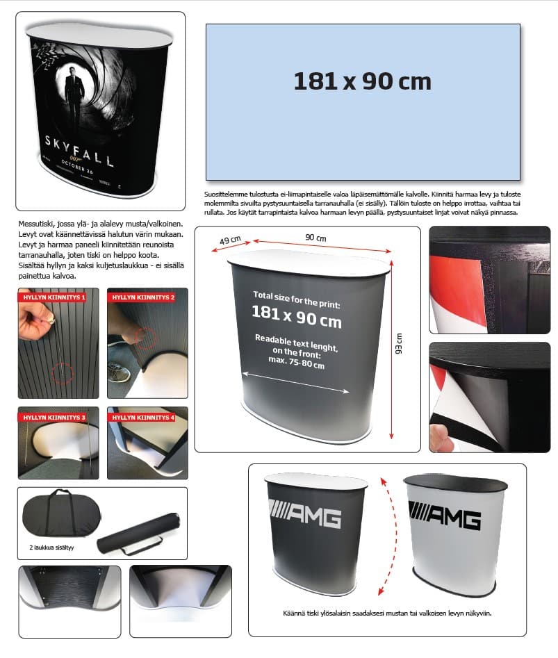 Kasaanmenevä messupöytä, jossa ylä- ja alalevy musta/valkoinen.