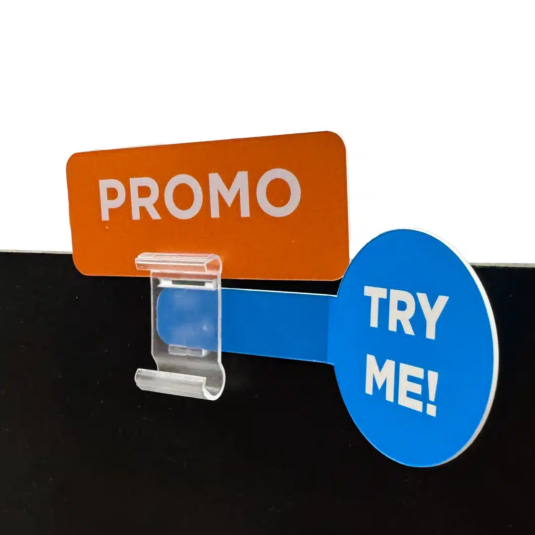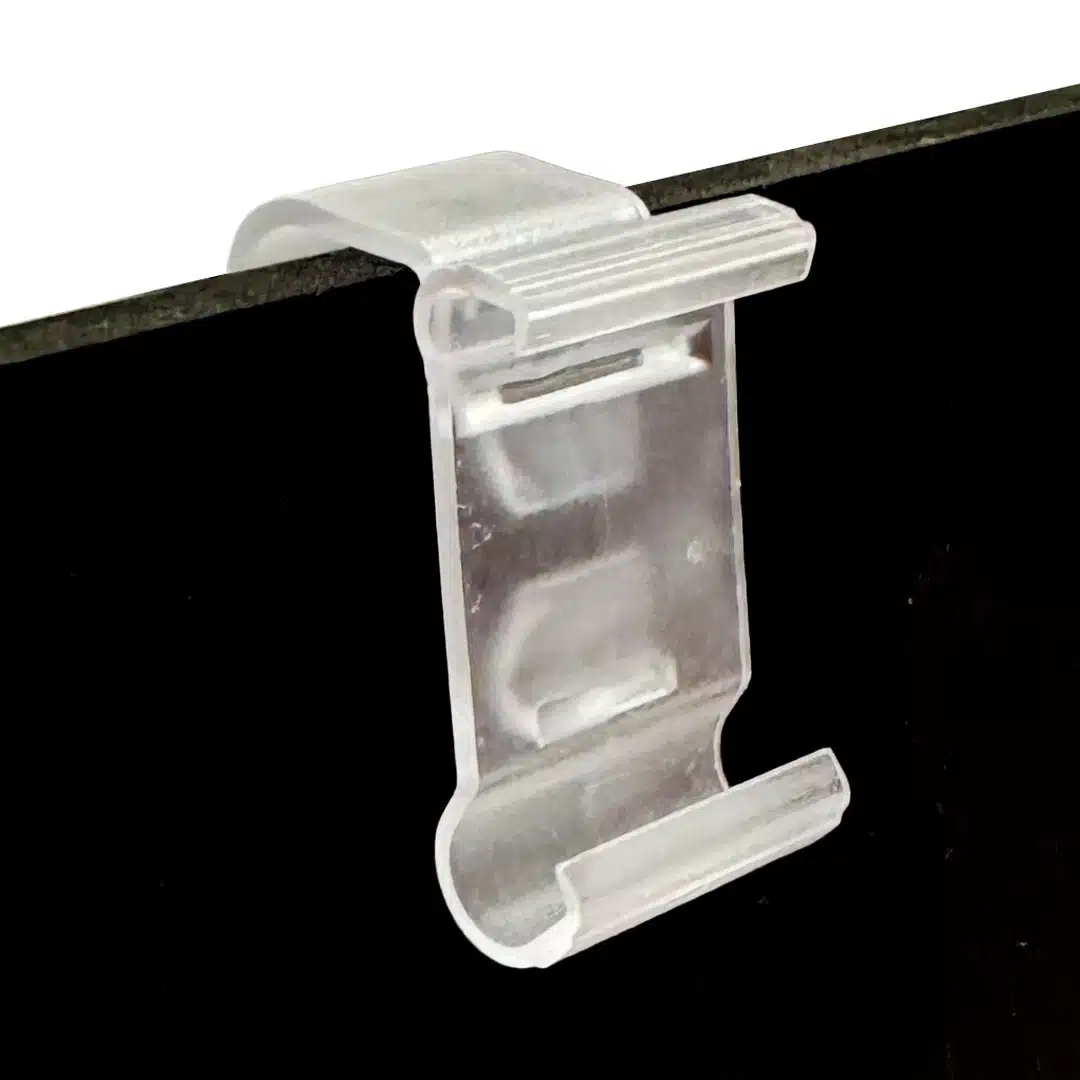 Kirkas elektronisen hintalapun kiinnike 3-14 mm materiaalin reunaan. Sopii esim. puisten, pahvisten ja muovisten tuotetelineiden reunaan.