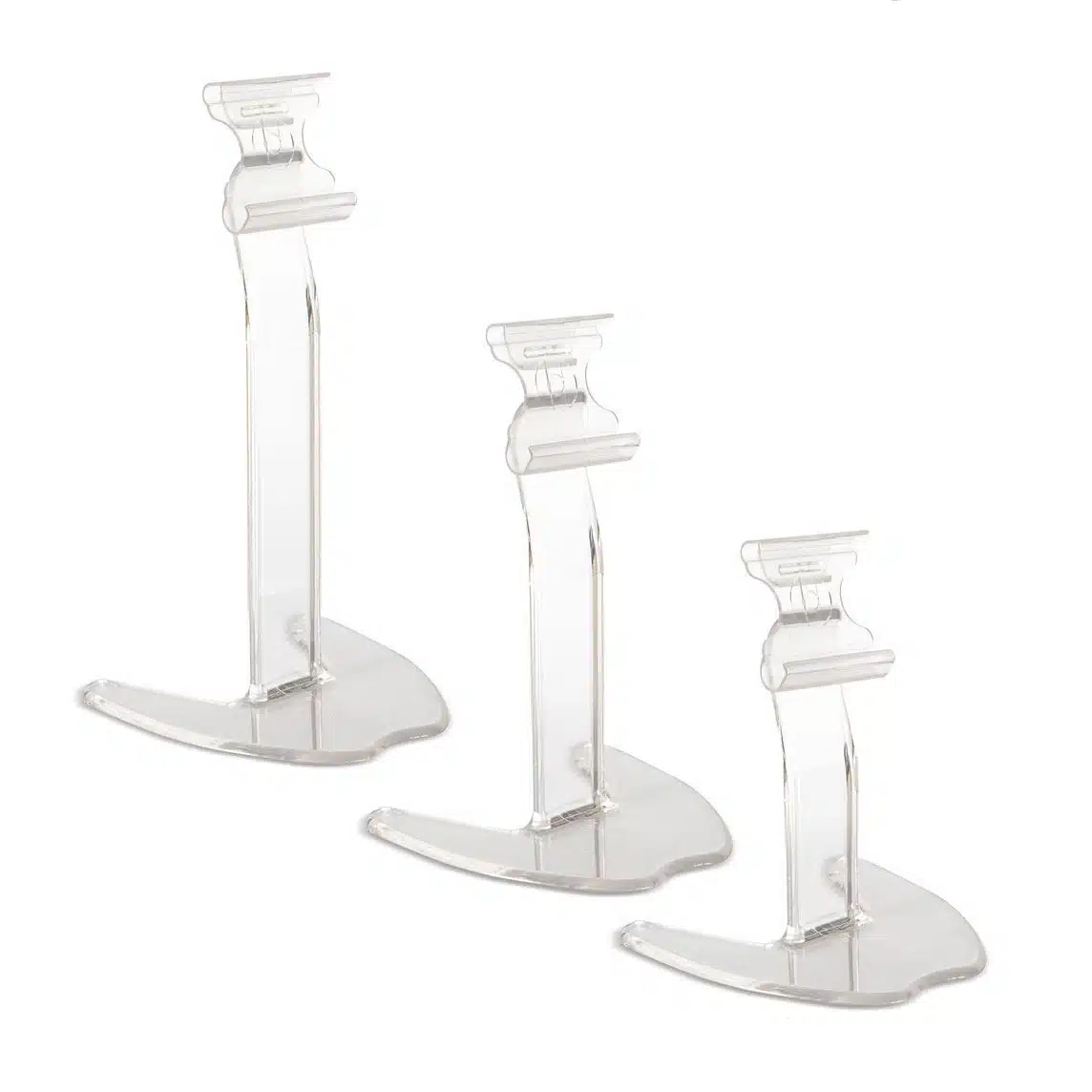 Läpinäkyvä jalusta elektroniselle hintalapulle. Saatavilla kolme eri korkeutta