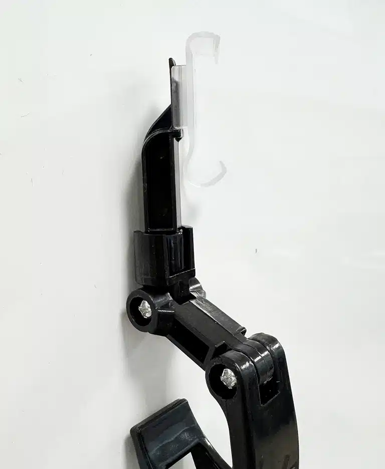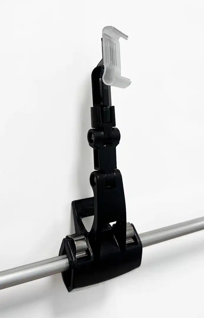 Musta, kaksisaranainen klipsipidike elektronisille hintalapuille.