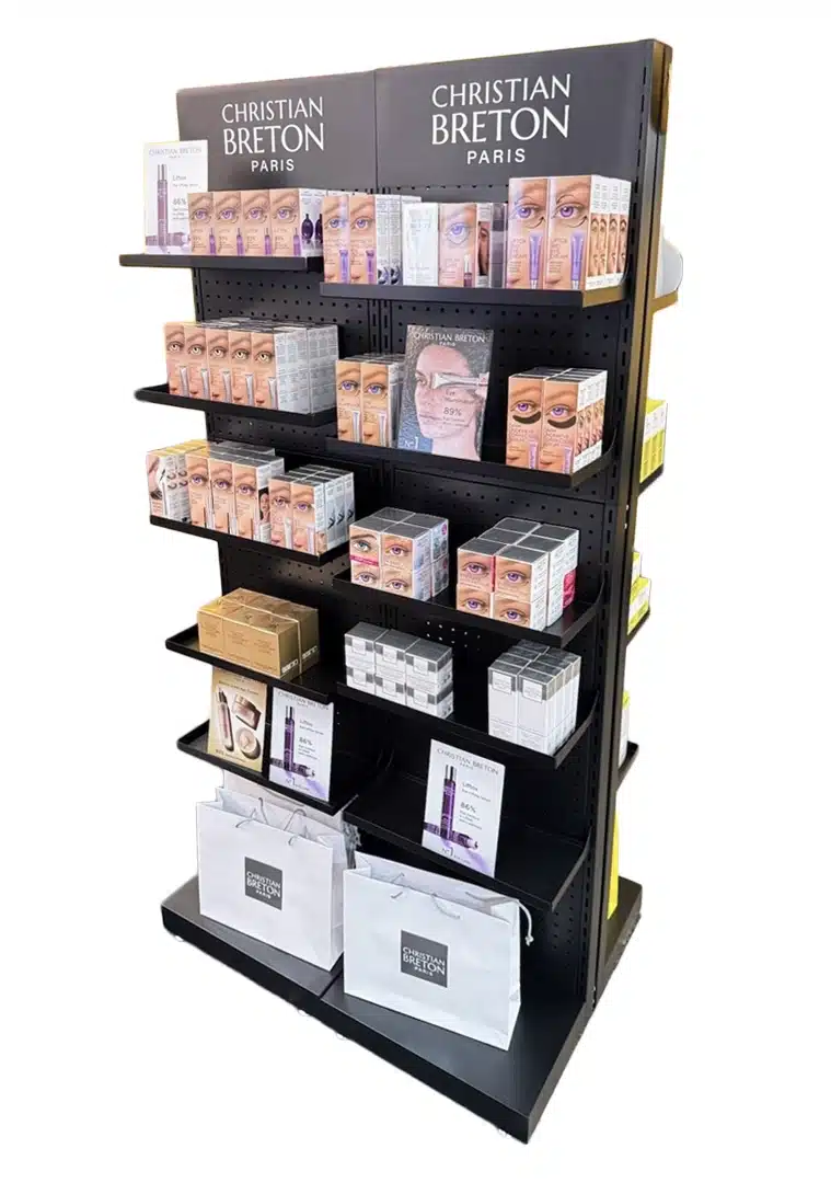 Metallista valmistettu yksipuolinen myyntiteline, jonka takaseinään voi kiinnittää pyöreän reiän piikkejä.