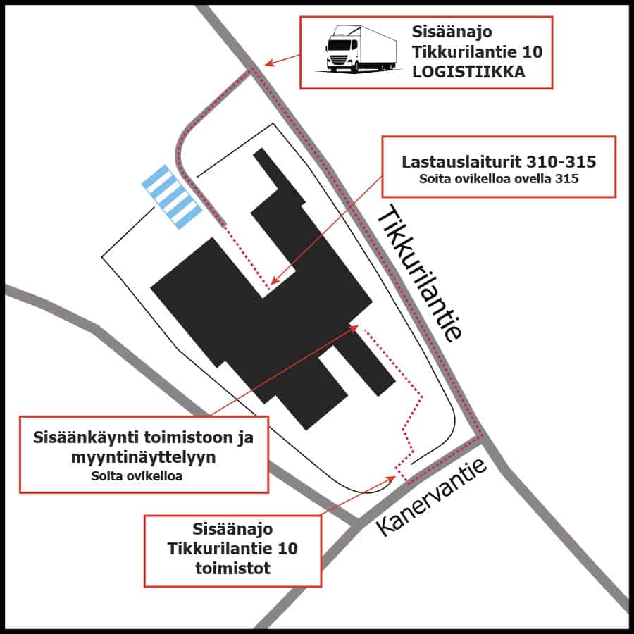 Sisäänkäynti myyntinäyttelyymme sijaitsee Tikkurilantien ja Kanervantien risteyksessä.